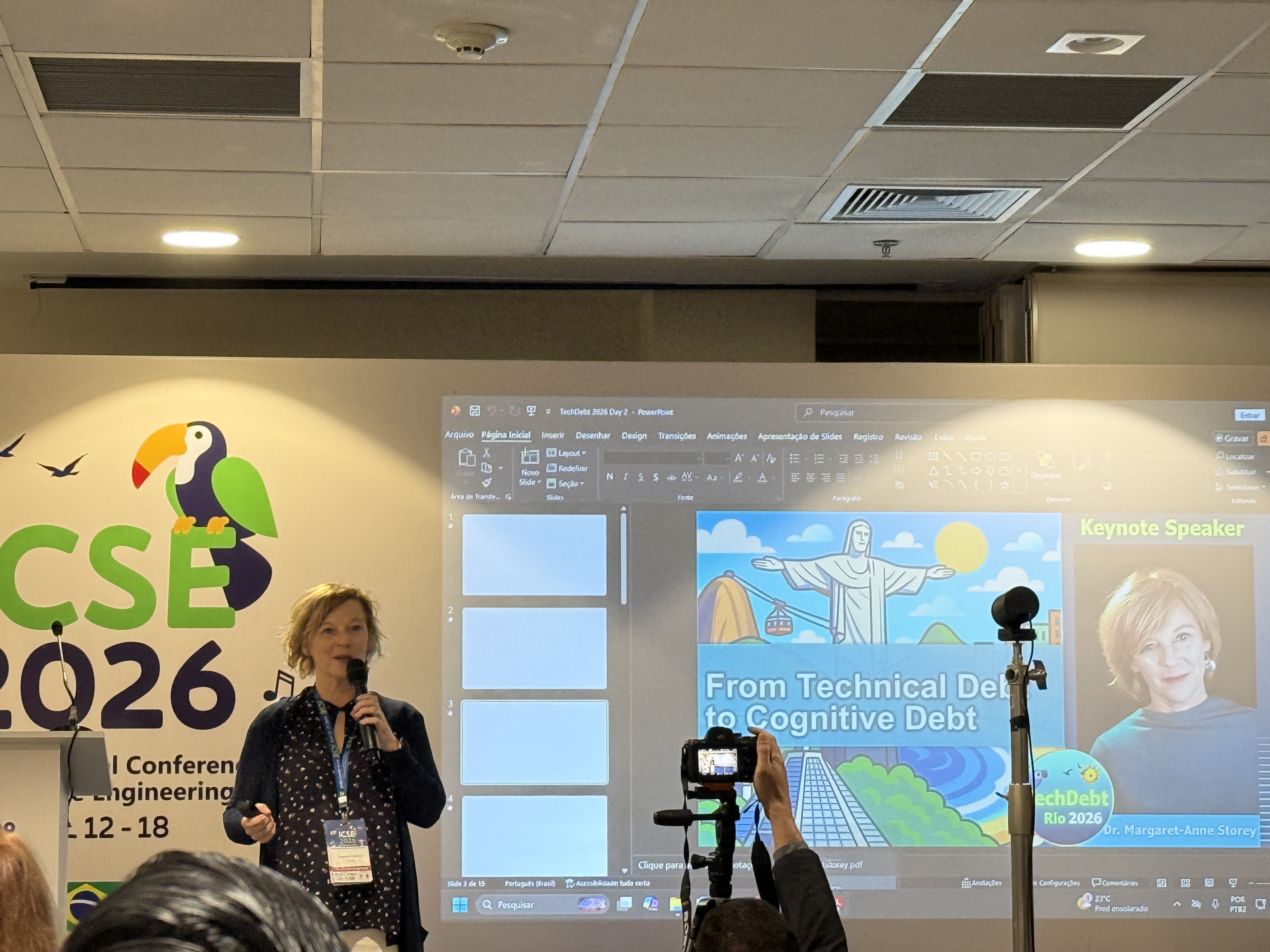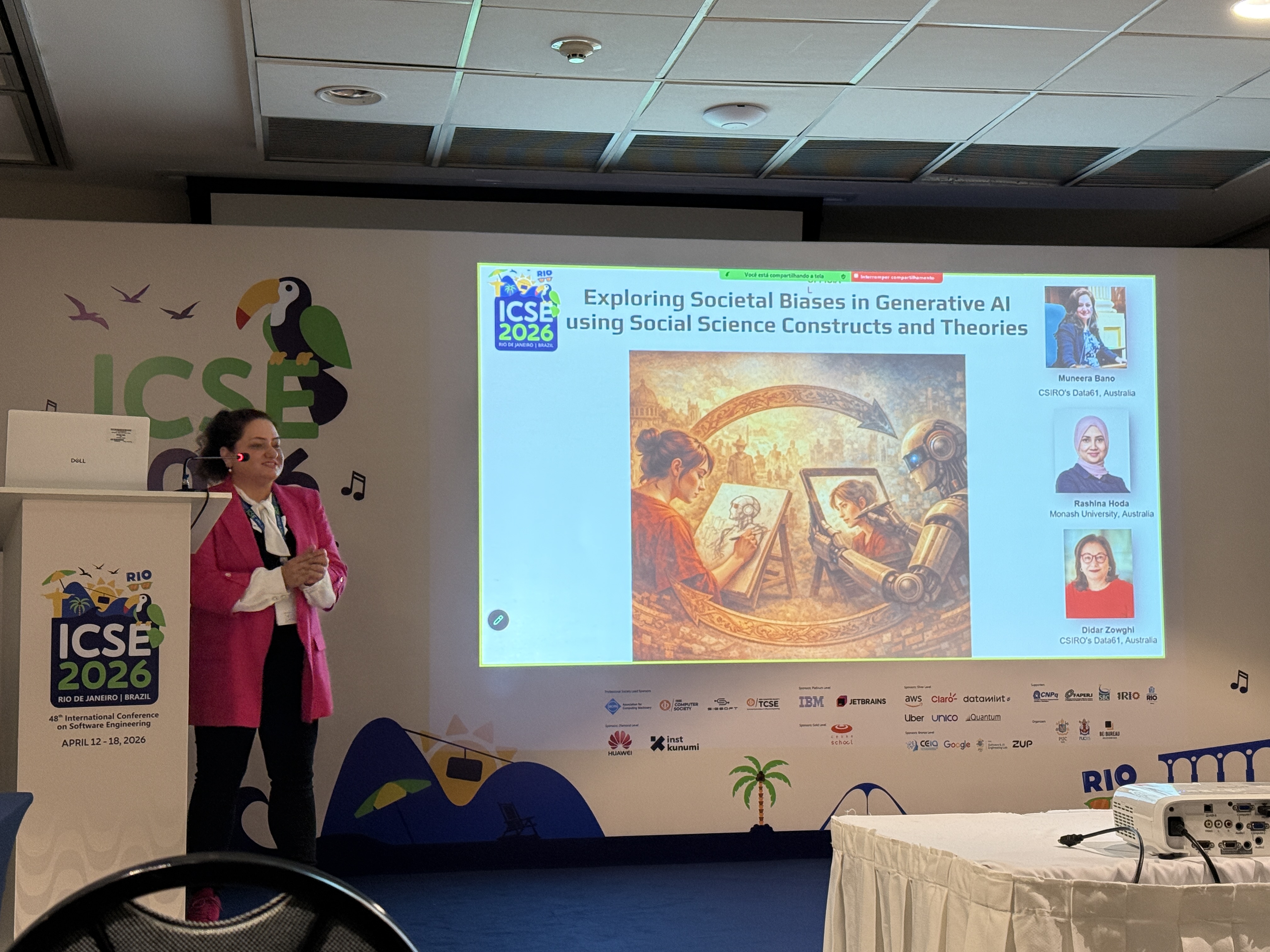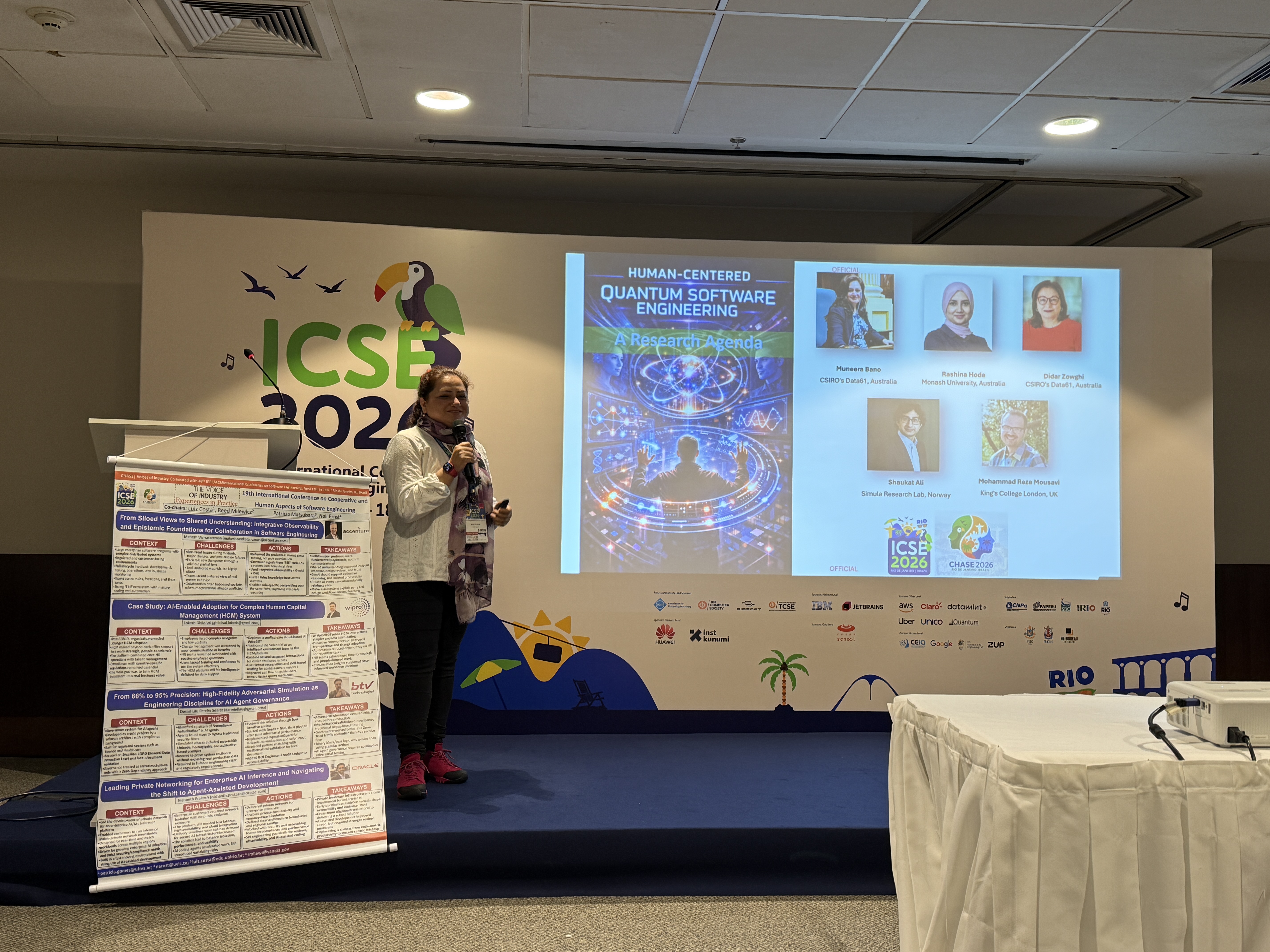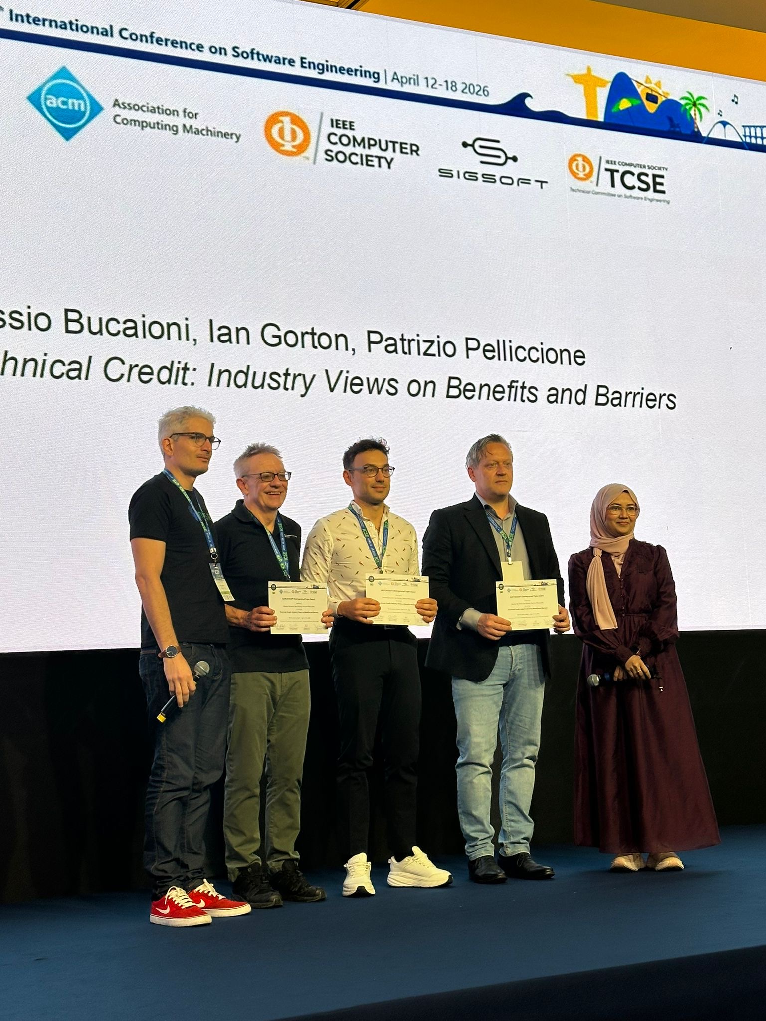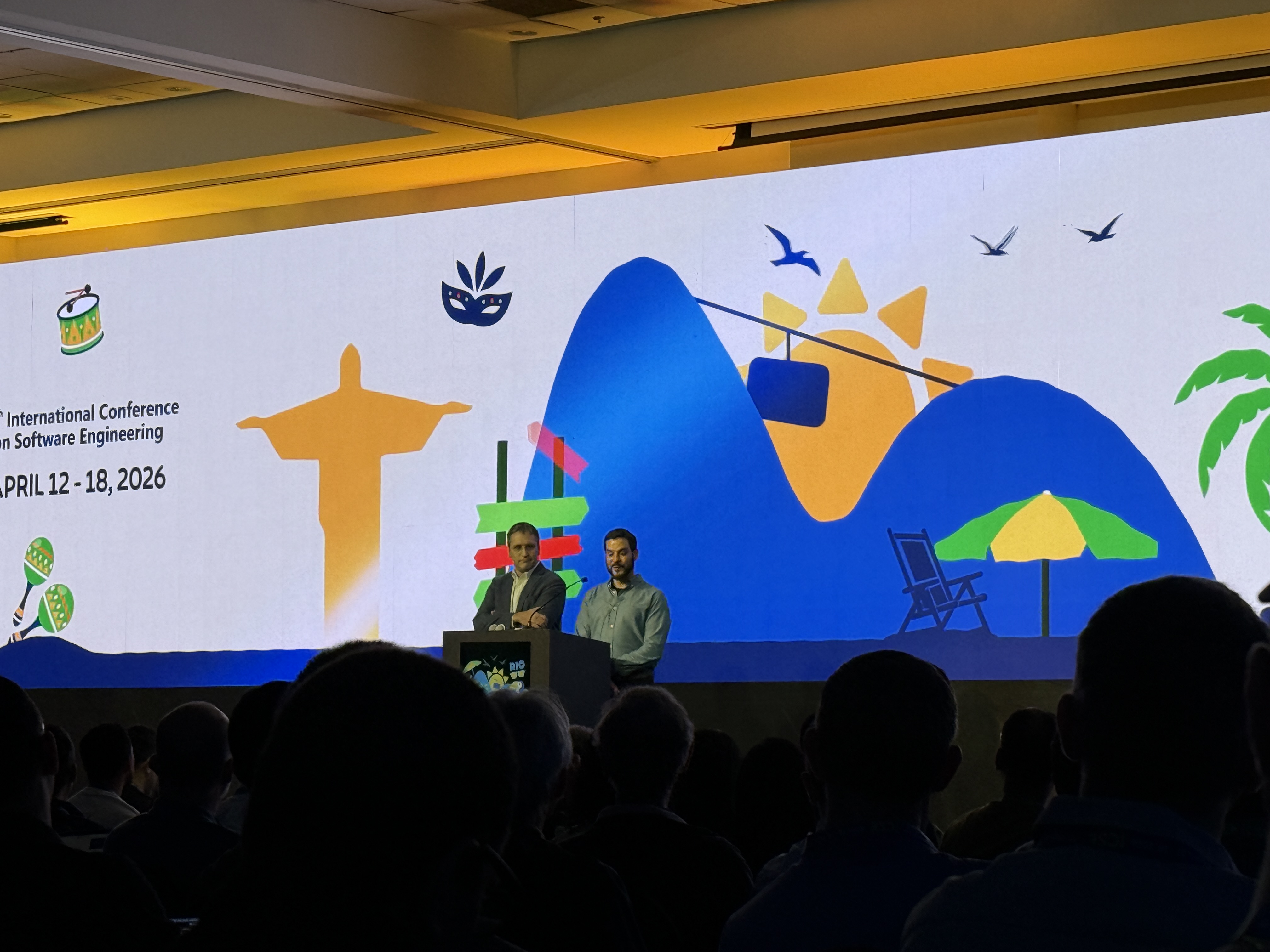 ICSE openings are always fun and Rio did not disappoint! Drum beats heralded the high energy conference that was about to unfold. General chairs Marcos Kalinowski and Rafael Prikladnicki welcomed the international SE community to Rio with open arms, while PC co-chairs Mira Mezini and Tom Zimmerman reminded us how ICSE 2026 was bigger than football with 51 countries represented, 3 more than the FIFA world cup 2026 🙂 This was followed by two smashing keynotes by Jan Bosch and our Australian colleague Qinghua (Lu) who is making us proud by representing us/SE at the United Nations platform.