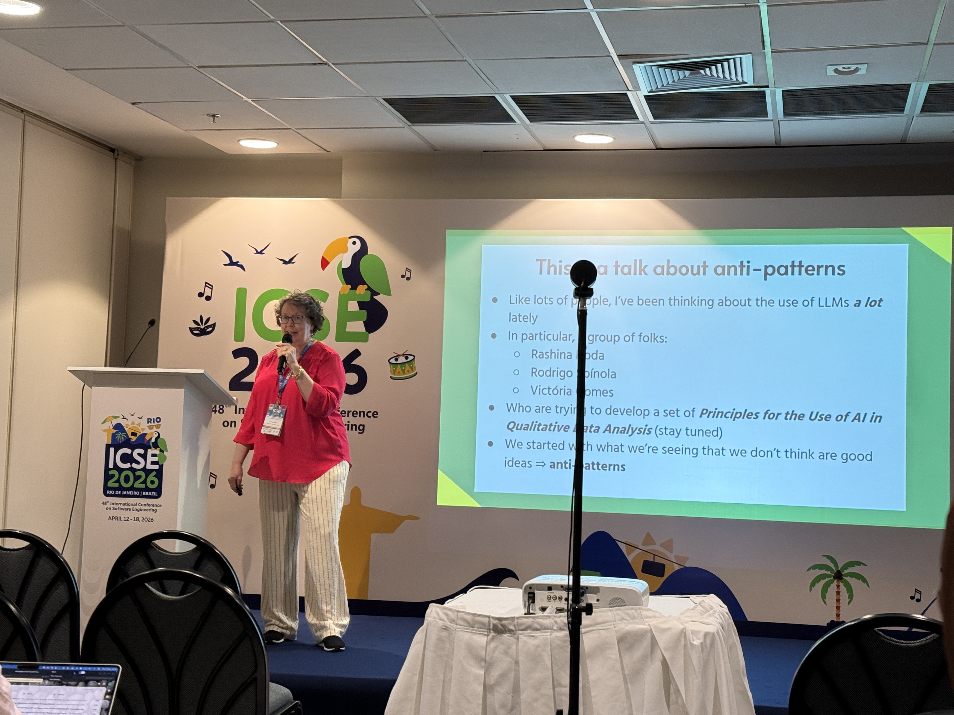 Monday morning presented a diabolical dilemma – keynotes by Peggy (Margaret Anne Storey), Carolyn (Seaman), and Emmerson Murphy-Hill in three different co-located events, in parallel! Where is Hermione’s time turner when I need it, I thought to myself 🙂 Because they were ever so slightly staggered I did managed to duck my head into each, staying for all of Carolyn’s keynote where she presented our collaborative work on “antipatterns” in using AI for qualitative data analysis (paper draft coming soon on Arxiv!) with Rodrigo Spinola and Victoria Gomes.
